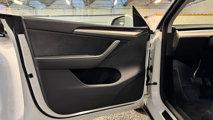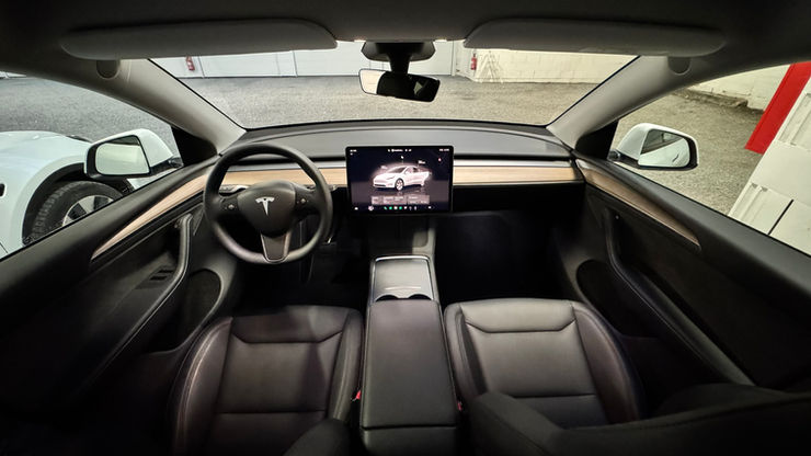 2. Met behulp van de camera's aan de voorzijde, achterzijde en zijkanten van de Model Y stelt het voertuig een waarheidsgetrouwe reproductie samen van de objecten rondom de touchscreen. De kleuren in de visualisatie geven de afstand tussen de Model Y en het weergegeven object aan.