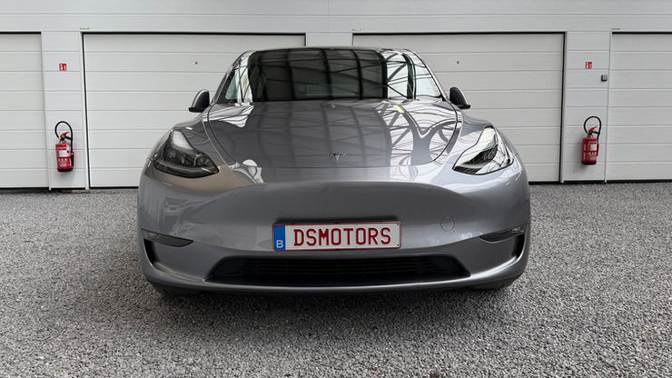 2. Met behulp van de camera's aan de voorzijde, achterzijde en zijkanten van de Model Y stelt het voertuig een waarheidsgetrouwe reproductie samen van de objecten rondom de touchscreen. De kleuren in de visualisatie geven de afstand tussen de Model Y en het weergegeven object aan.